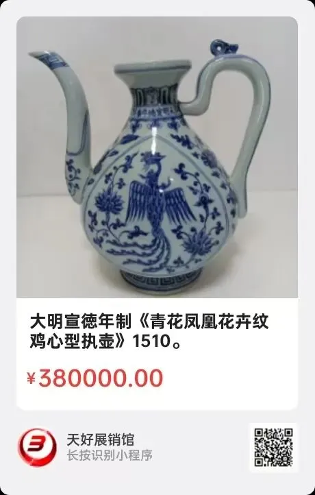 大明宣徳年制《青花凤凰花卉纹鸡心型执壶》,高23.2㎝,口径7㎝,圈足底径9㎝。简介:上述宣徳年制青花凤纹执壶,外观鸡心器型,隐喻天圆地方,天人合一的中华文化,象征着方圆人生智慧。壶有小盘口,缺盖,长流口,壶把高凸。青花釉色艳丽光泽。图纹多层设计,两主面凤凰花卉,鸡心双线,壶颈横写“大明宣徳年制”楷书,上有蕉叶,云纹围,整体给人一种造型隽永雅美之感!来源1510.V.