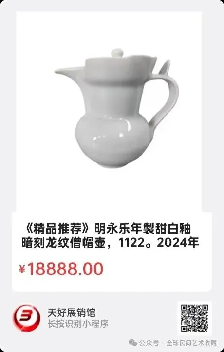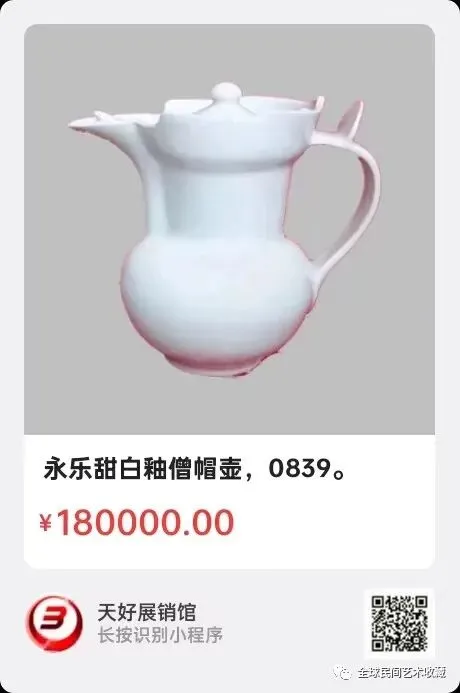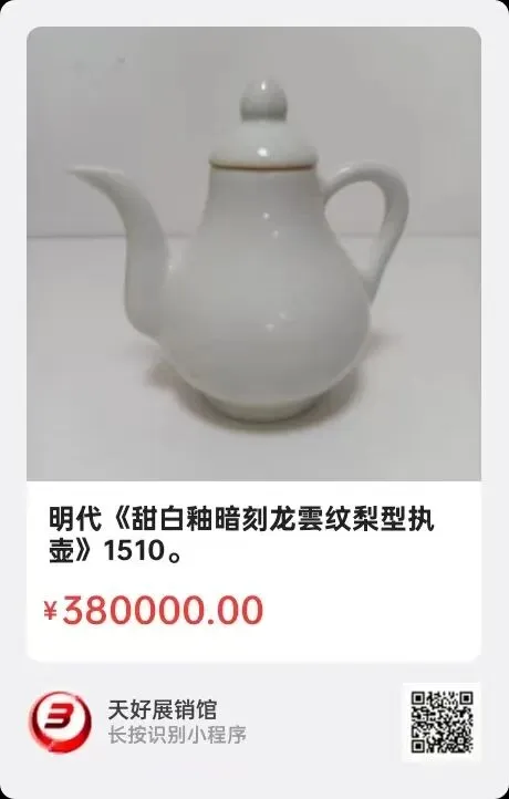 明代《甜白釉暗刻龙纹“天”字荸荠型执壶》,高21.5㎝,口径4.2㎝,圈足8.2㎝。简介:该《甜白釉暗刻龙纹“天”字荸荠扁型执壶》系明代成化年间宪宗皇帝宫廷专用饮酒器。该扁形壶似荸荠,扁腹,颈细长,曲柄连于肩腹,长水流,造型雅致。瓷器胎质轻盈薄厚均匀,白釉纯净肥润,光泽。因釉质感如白糖得名甜白釉。釉下暗刻龙雲纹,水浪纹,壶底喑刻隶书“天”字。因此执壶融合成化年制官窑甜白釉,暗刻纹,天字款,瓷胎薄如半脱脂等多项顶级工艺,堪称精品、美品!来源1510.V.