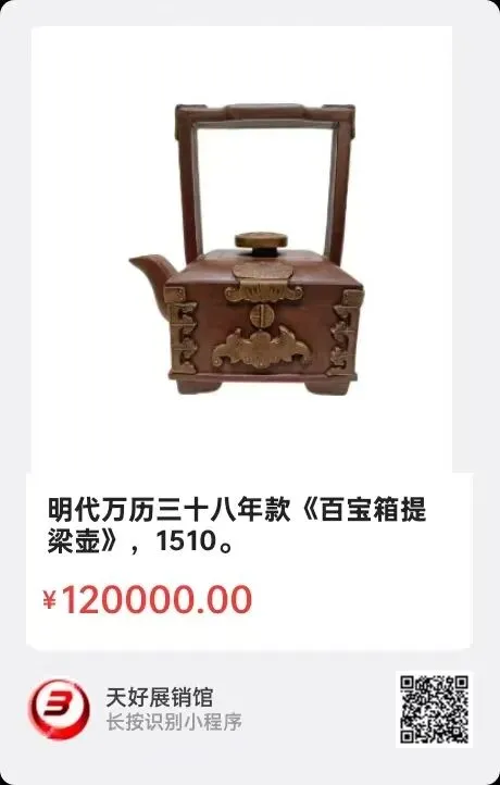 明代万历三十八年款《百宝箱提梁壶》,高18.2㎝,口径5.2x3.7㎝,底外径11.2x8.2㎝,总长16.2㎝。简介:明万历宫廷制作的百宝箱造型紫砂壶,距今四百余年。曾风名一时,有拍千万,近代顾景舟大师也仿制过。当时的官造紫砂壶大师有时大彬,供春,李仲芳,徐友泉等。此壶设计精湛,蝙蝠,如意装饰向征着吉祥幸福,宝钱饰品向征着财富,壶金饰包角,角型支足箱底,底方戳楷字“大明万历三十八年造”。壶型彰显富贵宝气,品茶人持以待客,茶香缭绕,奢华具享,充分滿足了达官贵显的雍容需求。来源1510.V。