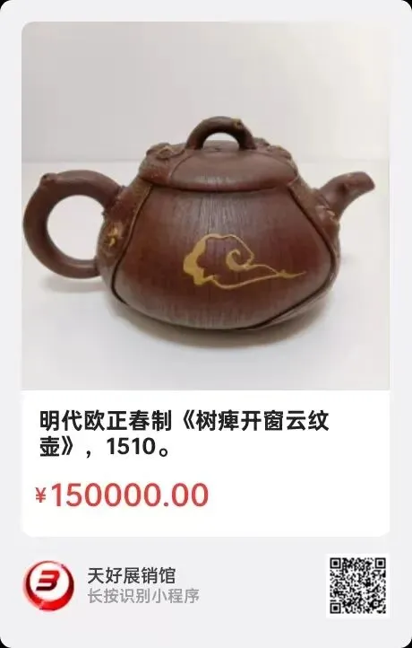 明代欧正春制《树痺开窗云纹壶》,高8㎝,口径6.2㎝,底足10㎝,总长17㎝。简介:明万历年间,紫砂壶制作大师欧正春,又名欧子明,系时大彬弟子,宜兴丁山镇创制仿〈钧陶〉出名,紫砂壶制作别具一格,花卉,果物及筋纹造型见长,后人仿其功力者众多,其作品在《阳羡茗壶录》等专籍均有记载。上述树痺开窗紫砂壶,系欧正春创新型,树干开窗描金色云纹,充分体现了其“严谨工艺与自然意象融合”的特殊风格。以后的清代,民国时期不少大师都仿造过此器型紫砂壶。来源1510.V。