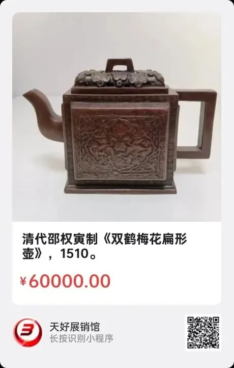 清代邵权寅制《双鹤梅花扁形壶》,高10.6㎝,口径6.6X2.3㎝,底径8x3.5㎝,总长15.8㎝。简介:上述黑色紫砂泥浮雕仙鹤梅花等缠枝花卉纹小方型扁壶,是清中晚期道光与光绪年间,宜兴川埠紫砂壶制作世家,时大彬弟子后人,制壶大师邵权寅制作。壶底印戳:权寅赦记。小壶工艺古拙,堆塑装饰,壶盖缕空,具动态美。该紫砂壶小巧精致典雅,工艺精湛,包浆秀美,是一件珍贵的艺术品!据传邵权寅的制壶技艺当年仅次于杨凤年(杨彭年之妹)。来源1510.V。
