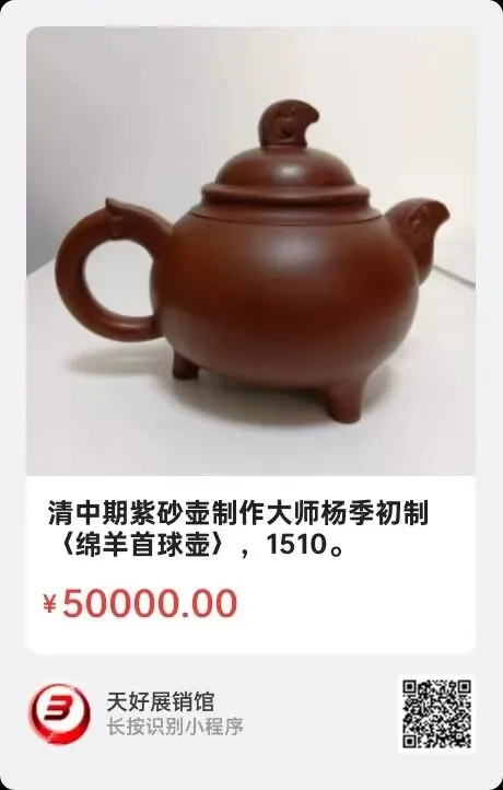 清中期紫砂壶制作大师杨季初制〈绵羊首球壶〉,高:12㎝,口径6㎝,底6.4㎝,总长17㎝。简介:雍正至乾隆年间,江苏宜兴紫砂泥绘名家杨季初,创意了紫砂色泥堆绘艺术,擅长制作菱花壶,笔筒,制壶制器讲究“雅,秀,精,巧”风格,泥绘画面层次匀称,清灵秀美,可见三维绘图效果。此类堆画曾拍出亿元。上述羊首嘴,钮,圆形三足紫砂壶,造型秀美,艺术感强,具有很高的文化艺术价值。来源1510.V。