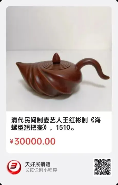 清代民间制壶艺人王红彬制《海螺型翘把壶》,高6.6㎝,口径3.9㎝,底径3.8㎝,总长16.3㎝。简介:清晚期宜兴丁山制壶高手王红彬,擅长老朱泥制壶,落款:红彬陶艺。喜制螺型小壶,技艺精湛,造型隽永,创新性强,很受民众喜爱。近年市场价值一直居高不下。来源1510.V。
