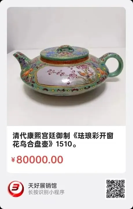 清代康熙宫廷御制《珐琅彩开窗花鸟合盘壶》,高7㎝,口径7.5㎝,圏足7.5㎝,总长19.5㎝。简介:清代康熙宫廷御制的珐琅彩各式图案紫砂壶,兴盛一时,达官贵人都以收藏精品观赏茗茶为荣。此件开窗花鸟,满釉缠枝花卉纹,突显雍容华贵!来源1510.V。