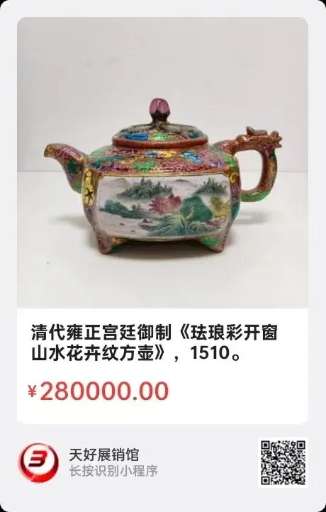 清代雍正宫廷御制《珐琅彩开窗山水花卉纹方壶》,高10.5㎝,口径6.5㎝,足距10.5㎝,总长19㎝,简介:清代雍正年制官造珐琅彩大开窗山水图纹,方型紫砂壶。四云足,龙首把,莲籽钮,滿厚釉,彩绘花卉纹,整体设计华贵典雅,气韵厚重,工艺精湛。此壶是清代宫廷珐琅彩紫砂壶中的精品,十分珍贵!来源1510.V。