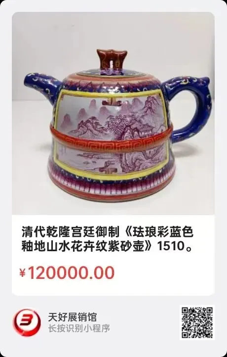 清代乾隆宫廷御制《珐琅彩蓝色釉地山水花卉纹紫砂壶》,高11㎝,口径5.8㎝,底径11.2㎝,总长18㎝。简介:清代乾隆年制《珐琅彩开窗山水,花卉装饰纹井台式紫砂壶》,色彩艳丽,敦厚,蓝釉底色,红釉描边,给人以美的享受。茶饮之余此器具很高的观赏价值,文化艺术价值!鉴于珐琅彩紫砂壶满釉工艺,工序复杂耗工,虽美但影响透气,逐渐就淡出制作。此类紫砂壶市场价值很高!来源1510.V。