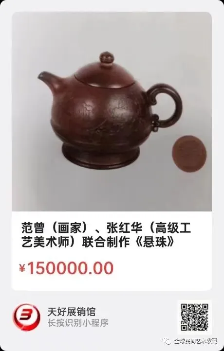 范曾(画家)、张红华(高级工艺美术师)联合制作《悬珠》紫砂壶。壶面浮雕小放牛图,范曾署名。壶底戳记张红华。壶高13㎝,口径6.1㎝,底径9.5㎝。来源1510.V.