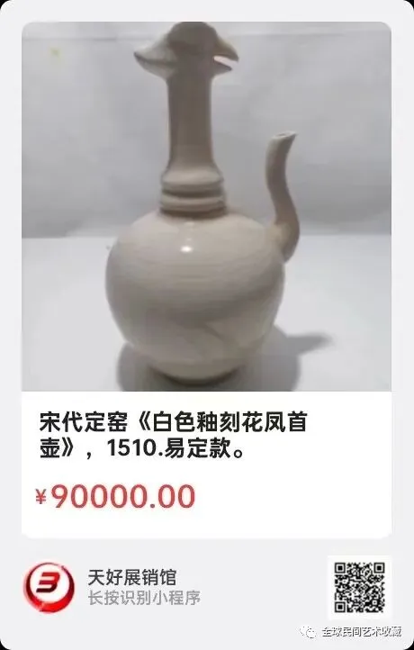 宋代定窑《白色釉刻花凤首壶》,易定款。高23㎝,底径6㎝。简介:此凤首壶系宋代河北易州定州一带官窑址生产,釉色白而滋润,透玻璃质,在壶类造型中珍奇。来源1510.V.