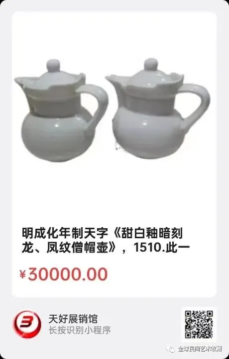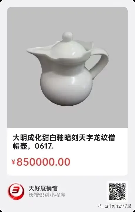 明成化年制天字《甜白釉暗刻龙、凤纹僧帽壶》,髙11㎝,底径4.3㎝。此一对小壶,一龙一凤,工艺精湛,刻划栩栩如生,小巧玲珑,非常珍罕!来源1510.V。