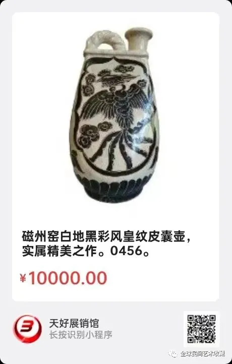 磁州窑白地黑彩风皇纹皮囊壶,实属精美之作。高32厘米,来源:0456。V 。