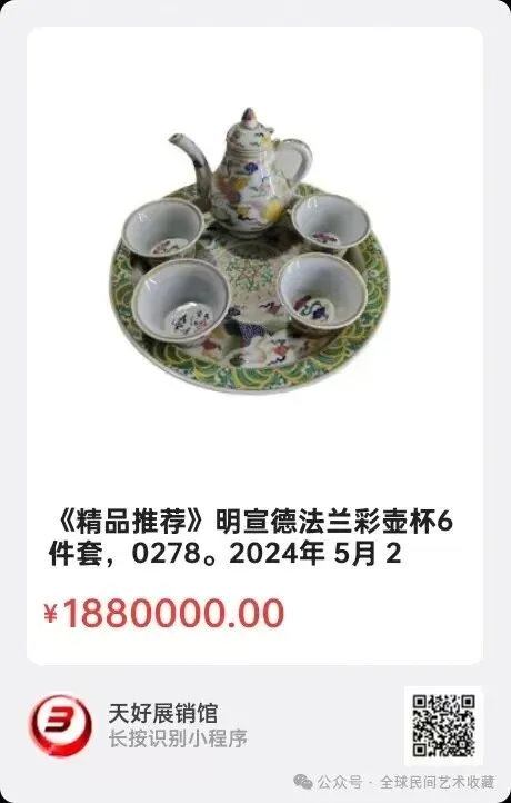 明宣德法兰彩壶杯6件套,尺盘子:直径22cm,其中一个杯子有一道老线。2024年 5月 22日,经天好评审团评审,以6票优势荣登精品榜,获第127期天好海选精品。来源0278.V.