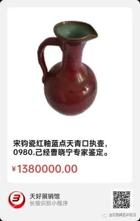 《北宋钧窑天蓝釉窑变紫色斑立口壶》,高32.3㎝,口径3.9㎝,底径9.3㎝,腹宽18㎝。简介:此北宋钧窑自然窑变紫色斑执壶,体型硕大,胎厚坚实,壶长颈弘纹立口,圈足露褐色胎,水流与把分别在壶肩、颈衔接,设计优美,壶整体天蓝釉,高温烧制,窑变中非人工描绘,出现大面积流淌状紫色斑,绚丽多姿!真可谓:“入窑一色,出窑万彩”!宋代钧窑天蓝釉窑变紫色斑执壶,如霞似锦的绝美意境,是当今最受追崇的古瓷器之一。最具市场价值!来源1510.V.