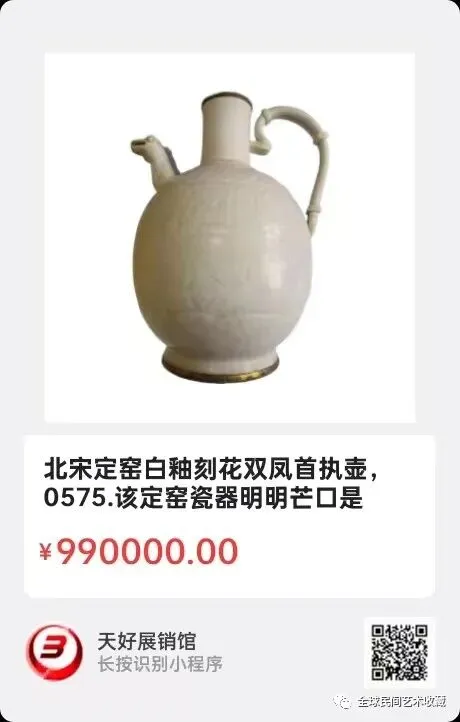 北宋定窑白釉刻花双凤首执壶,口径:4.7厘米,足径:9.2厘米,高:21.5厘米,重量:775克。该定窑瓷器明明芒口是当时烧选工艺缺陷,却可以金镶口,底,是器物锦上添花之美感,难得一见珍品,佳作。来源:0575。