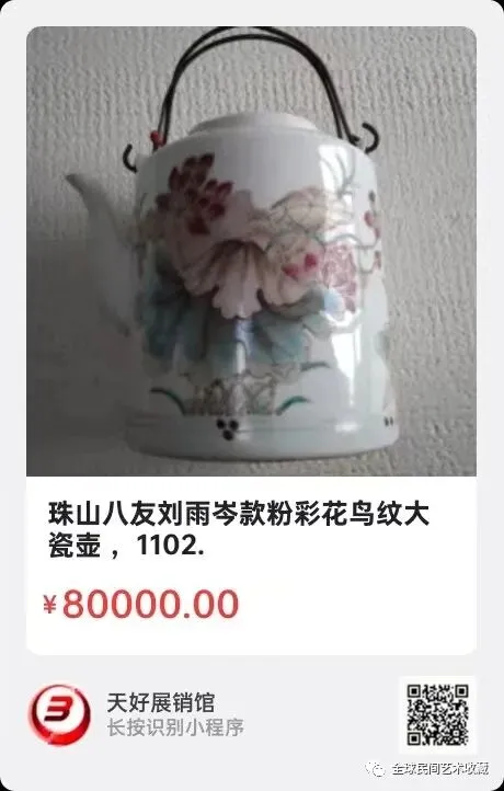 珠山八友刘雨岑款粉彩花鸟纹大瓷壶 。 尺寸:直径19厘米,高22厘米。刘雨岑(1904-1969),民国珠山八友之一,以画花鸟著称。刘雨岑创立了著名的“水点桃花”技法(后世非常出名的7501瓷便是引用此技法)。刘雨岑的作品,建国前的大都被海内外的收藏家珍藏;建国后在轻工部陶瓷研究所创作的众多珍品,大都收藏于国内外博物馆中。刘雨岑在珠山八友中年龄最小,艺术成就最高,画作名气最大,社会地位也最高(历任中国美协江西分会副主席,景德镇陶瓷美协主席等,拍卖市场价格过几百万的刘雨岑的作品,大部分是与珠山其他七位或是几位合作的作品,其单副作品拍卖市场很少见,出现价位就会比较高,而合作的作品,较多且价位也较高。此壶器型硕大,造型古朴、传统,画工精湛,集诗、书、画、印于一身,品相完好,是难得的刘雨岑瓷画艺术精品, 此壶经本平台鉴定专家曹晓宇老师鉴定为解放前后刘雨岑作品真品。具有较高的收藏价值,艺术价值,经济价值和投资价值。来源:1102。
