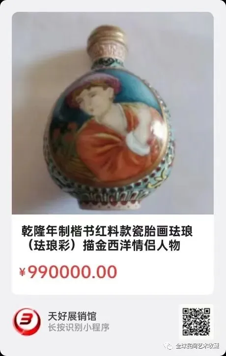 乾隆年制楷书红料款瓷胎画珐琅(珐琅彩)描金西洋情侣人物纹鼻烟壶 高 6,5厘米。珐琅彩鼻烟壶是宫廷御用珍玩。珐琅彩鼻烟壶大多为铜胎或料器胎居多,瓷胎珐琅彩鼻烟壶非常稀有、名贵、价高,属顶级奢侈品,是皇室贵族高档的收藏把玩艺术品。有极高的把玩收藏价值。来源1102.
