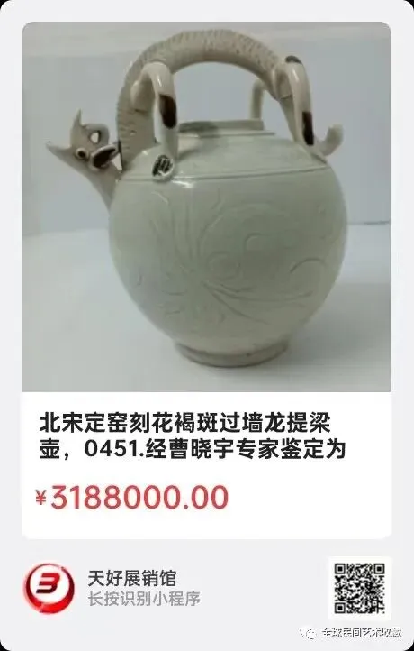 北宋定窑刻花褐斑过墙龙提梁壶,高18Cm,口径5.1Cm,㡳径7.2Cm,经曹晓宇专家鉴定为真品。来源:0451。V.