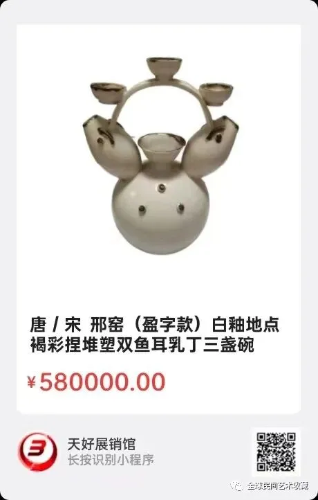 唐/宋 邢窑(盈字款)白釉地点褐彩捏堆塑双鱼耳乳丁三盏碗灯壶,高:29.3,两鱼耳距:21cm,8.5cm。来源1526.