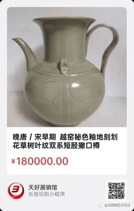 晚唐/宋早期 越窑秘色釉地刻划花草树叶纹双系短胫撇口樽式壶,高:19.8cm,口径:10.8cm,底径:8cm。可议价交流易物。来源1526.