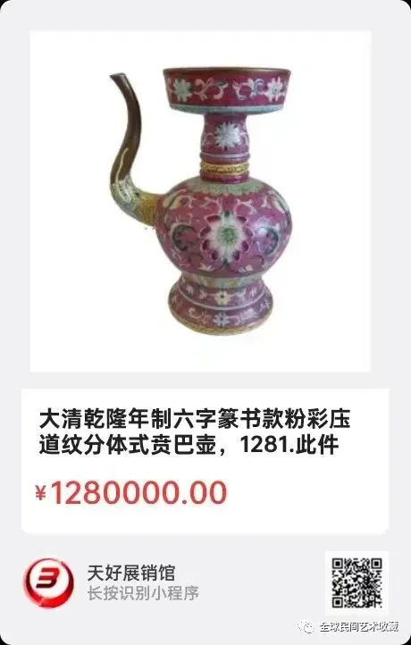 大清乾隆年制六字篆书款粉彩庒道纹分体式贲巴壶,高28cm,足径13.4cm,此件藏品参加过2012年江苏万达国际拍卖有限公司的拍卖。来源:1281.