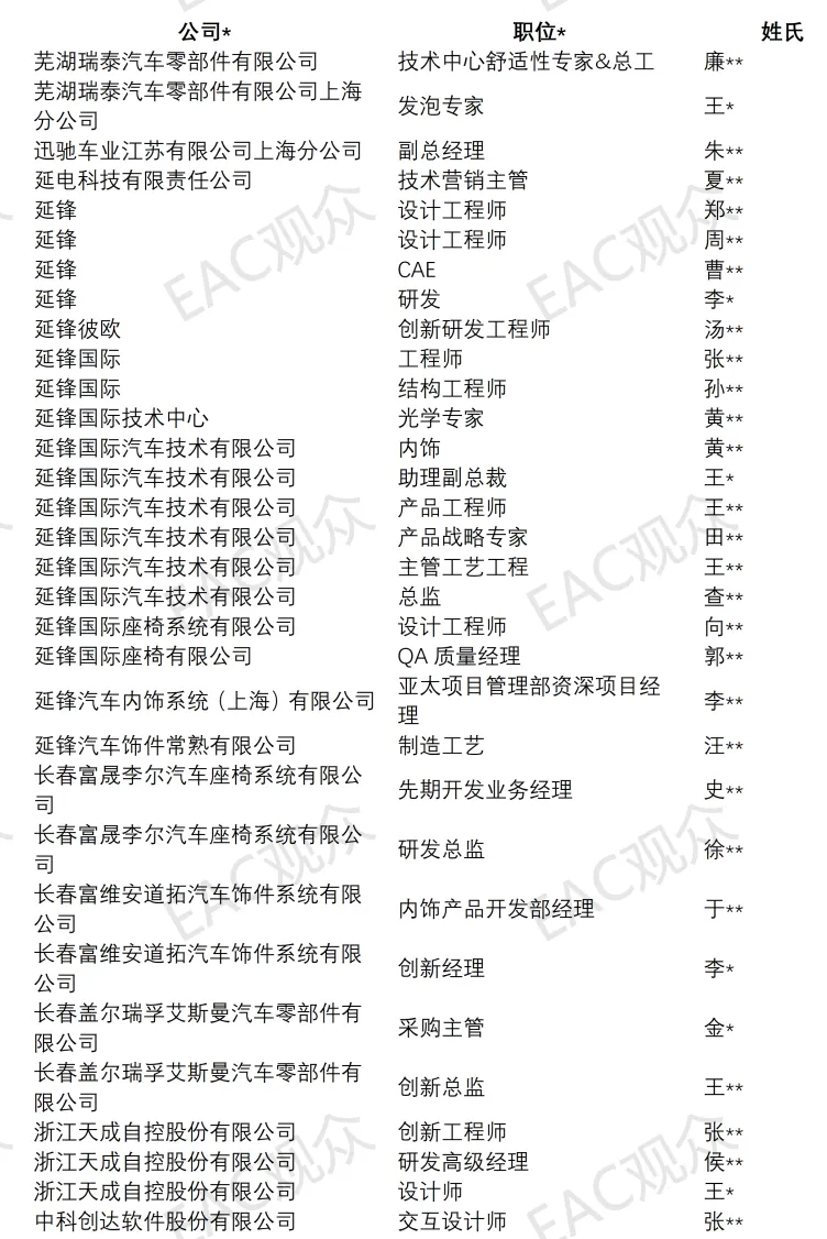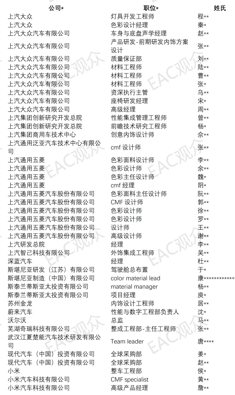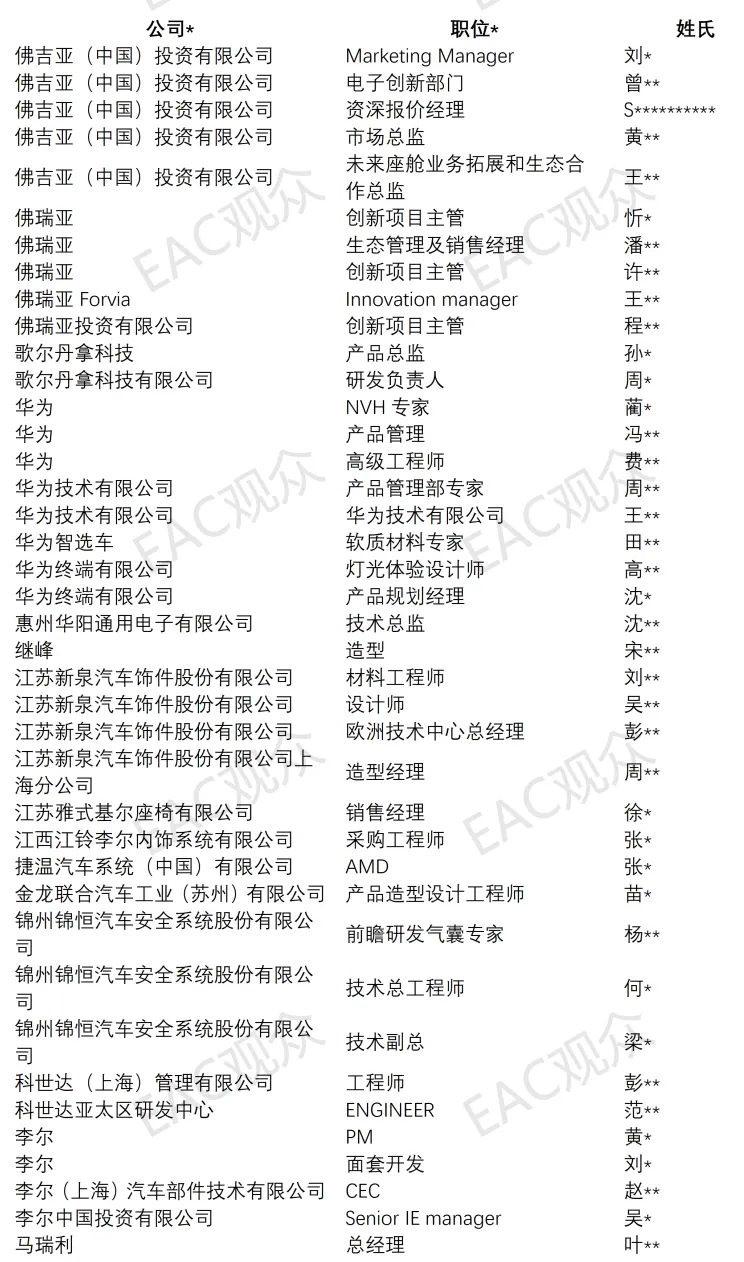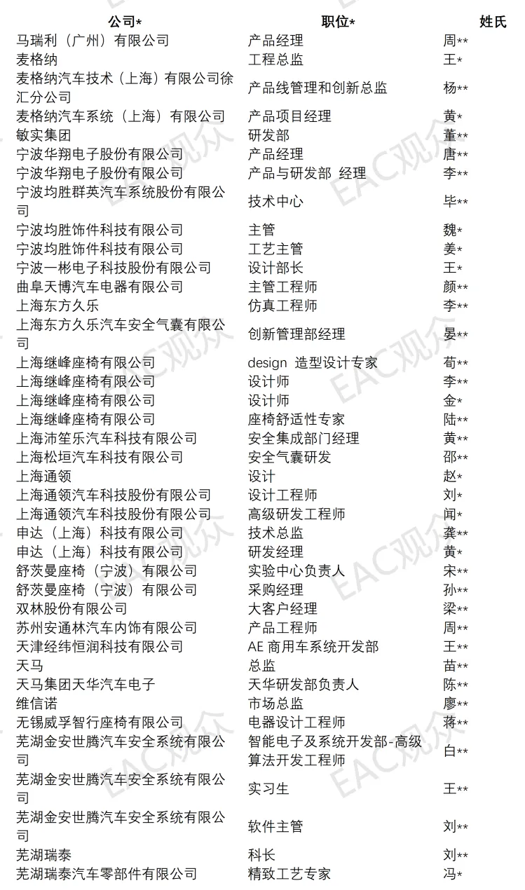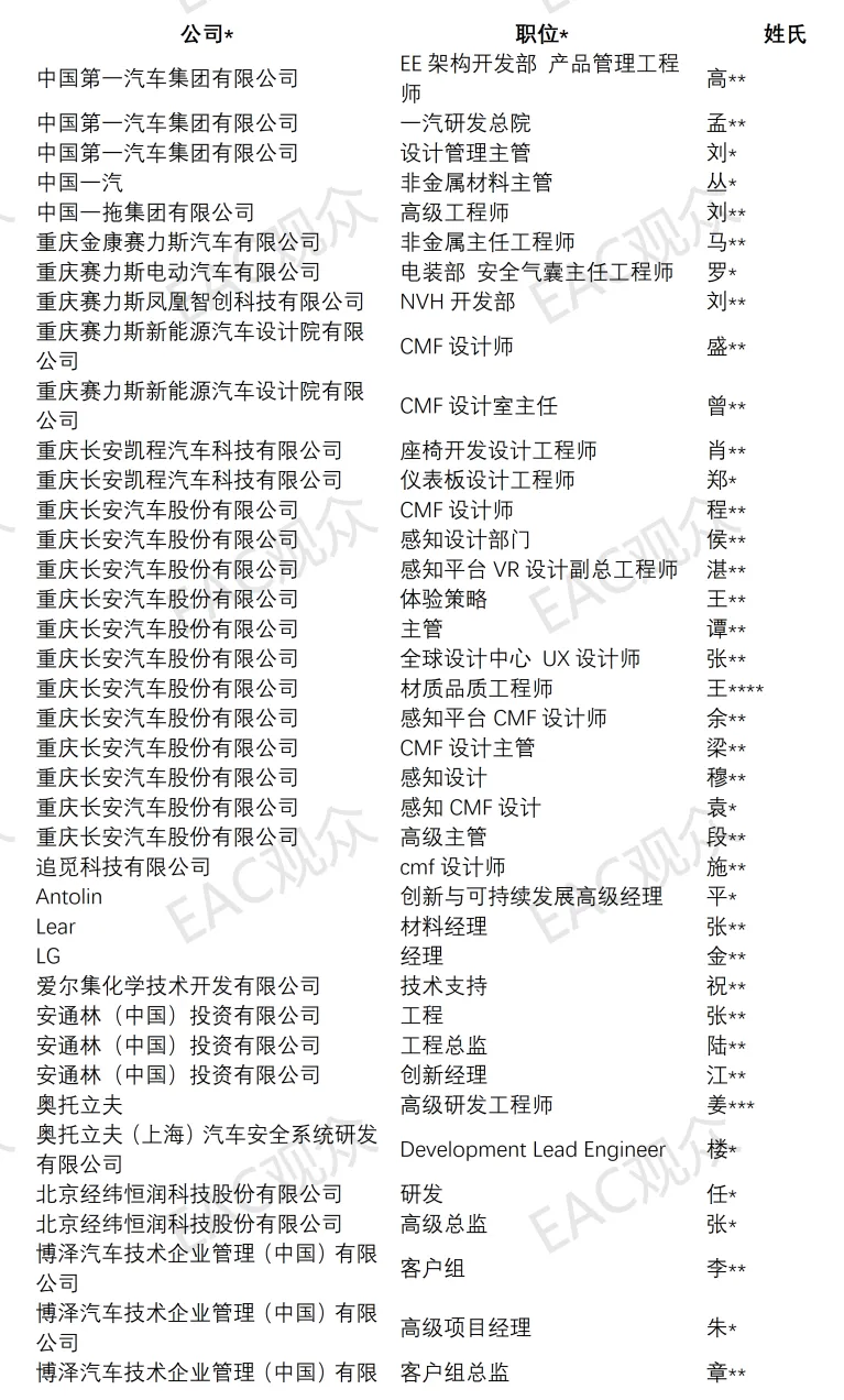 截至目前已报名8人参会,覆盖NVH 专家、软质材料专家、高级工程师、产品管理、灯光体验设计师等重要岗位。