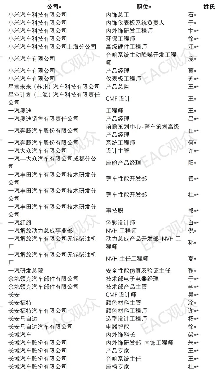 截至目前已报名11人参会,覆盖整车工程部工程师、内外饰研发工程师、内饰总工、音箱系统首席调音师四大核心岗位;覆盖小米 SU7、小米 SU5(待发布)、小米 SU7 Max、小米 SU7 Ultra等车型