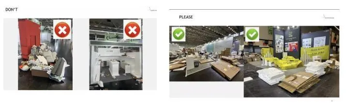 2、 布展期间,主办方安排的垃圾清运公司将会统一为您处理展品包装垃圾,请严格按照图示整理压扁叠放在通道旁。