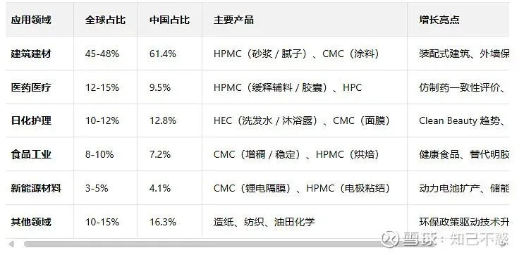建筑建材为最大应用领域,占比超 45%;医药、食品、日化等领域快速增长。