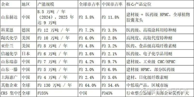 2024 年全球纤维素醚总产能约 180-200 万吨 / 年,中国贡献 60% 以上;其中 HPMC 产能占比超 45%,中国 HPMC 产能约 65 万吨,占全球近 60%。
