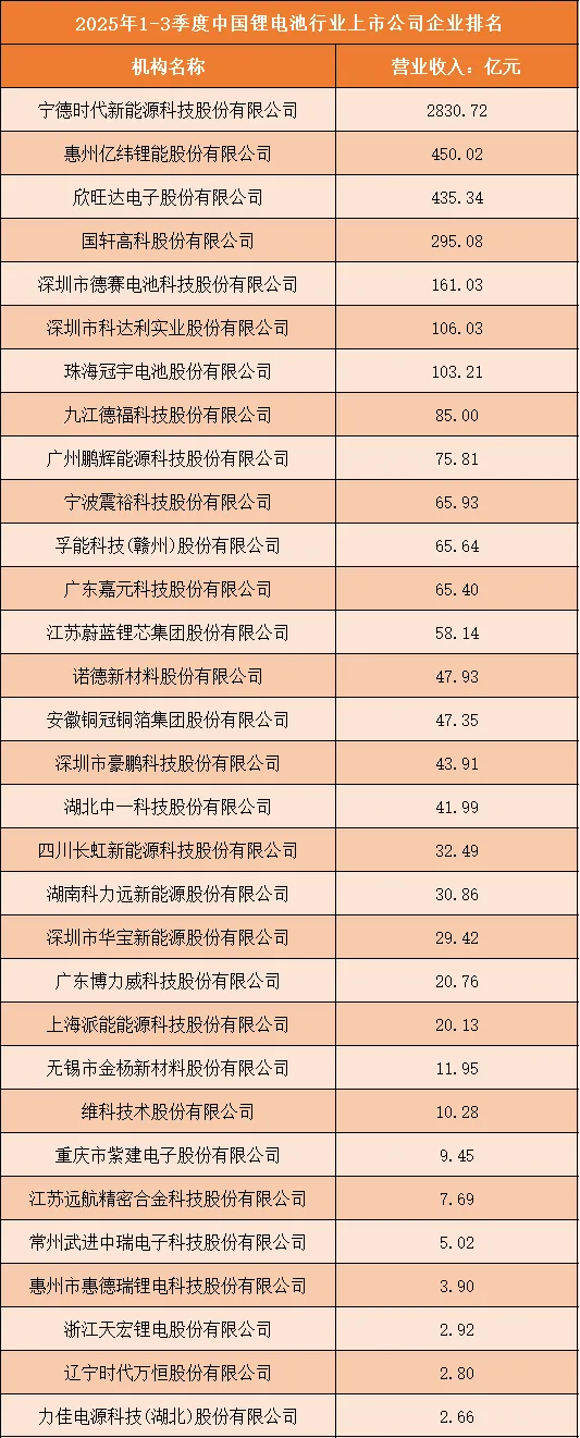 根据申万行业分类,2025年1-3季度中国锂电池行业上市公司按营业收入排名如下:(A股上市公司)