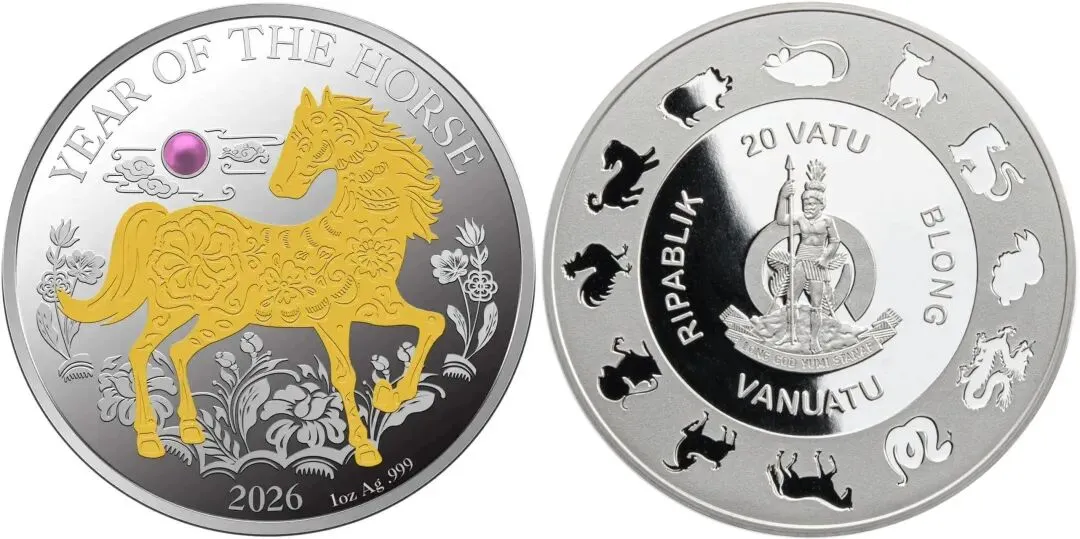 正面是瓦努阿图国徽、周边铭文国名、外周是12生肖的象形图。