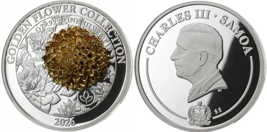 反面为3D镀金大丽花,其左花名、其下系列标志、其上有含量、材质、纯度等参数。圆弧顶部铭文系列名称。底部发行日期。