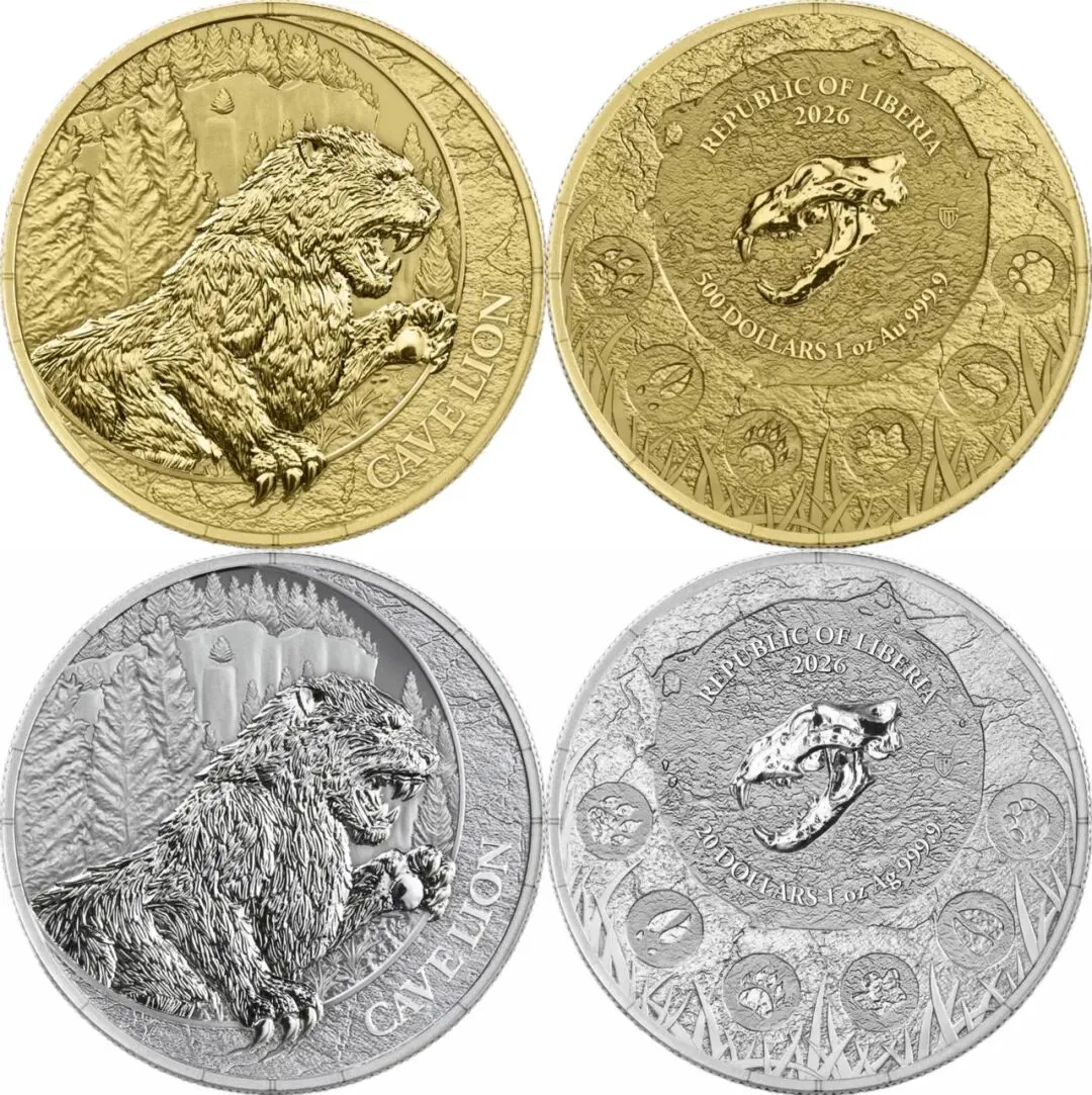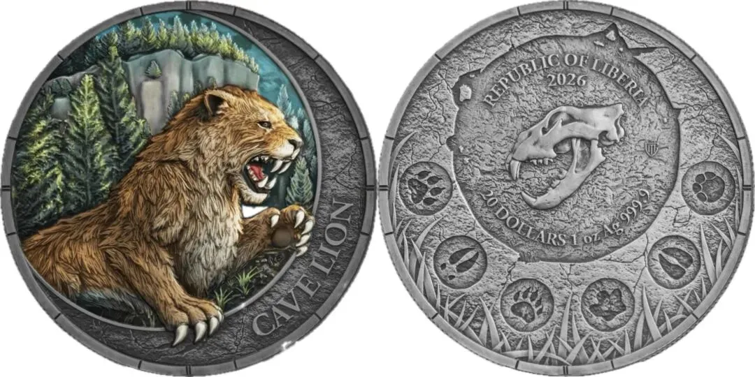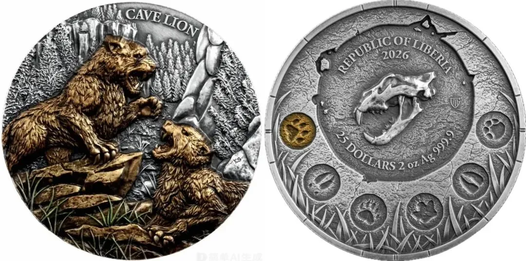反面反映了洞穴狮子的自然栖息地,被群山和原始森林所包围。张开獠牙、放声吼叫、利爪紧绷,在决定生存的时刻跳跃出击。日耳曼铸币厂造币