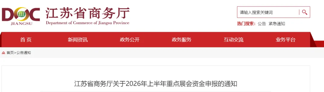 “江苏省展会扶持资金申报系统”将于2026年4月30日前开放。展会实际开展日期在6月30日前(含6月30日)的展会项目申报将于2026年7月21日17:00截止。