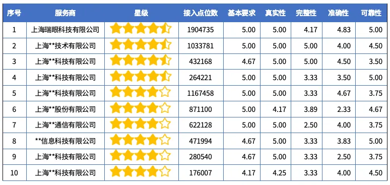 其中,上海瑞眼科技有限公司以接入点位数190万余个位居首位,在基本要求、真实性和可靠性三项指标均获满分5.00分,综合表现突出。