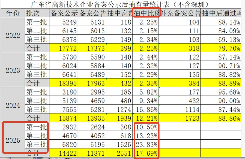 从近三年的广东省高新技术企业备案公示后抽查情况来看,抽查的比例是逐年提高,所以并不是认定为高新后企业就高枕无忧了,必须做好研发费用辅助账和备查资料库,随时做好被抽查的准备。