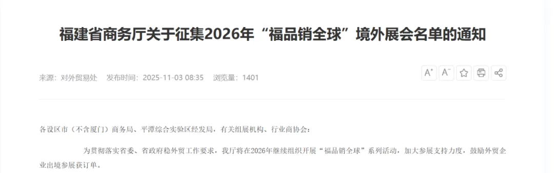 2026年继续组织开展“福品销全球”系列活动,加大参展支持力度,鼓励外贸企业出境参展获订单。