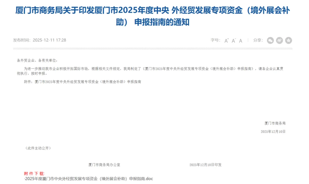 《2025年度厦门市中央外经贸发展专项资金(境外展会补助)申报指南》
