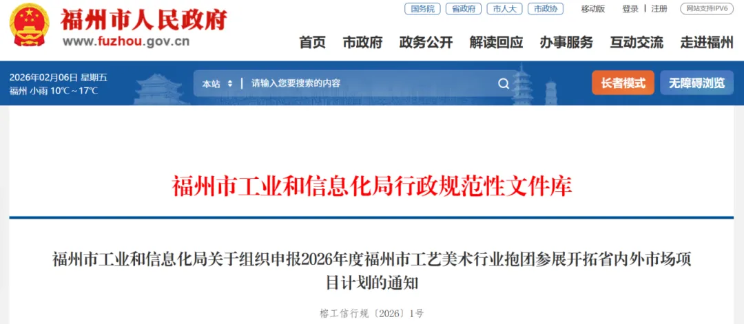 《福州市工业和信息化局关于组织申报 2026 年度福州市工艺美术行业抱团参展开拓省内外市场项目计划的通知》