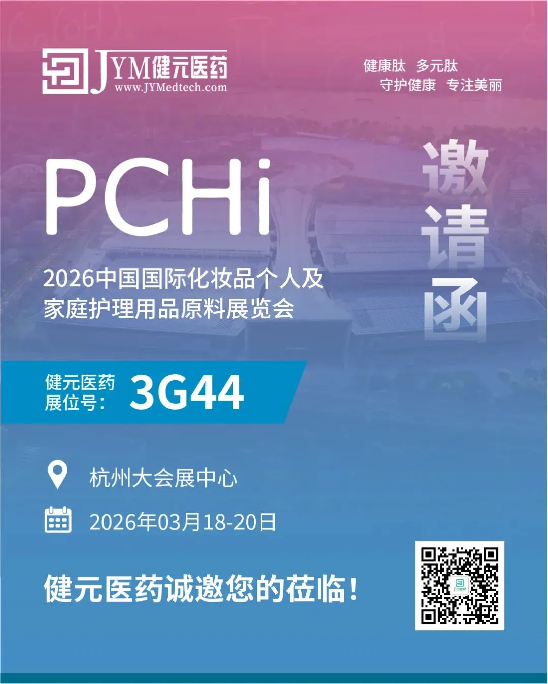 2026年3月18日-20日,PCHi2026将在杭州大会展中心隆重举行。健元医药作为集多肽产品研发、生产和销售为一体具有自主知识产权的创新型医药企业,将在多肽领域形成的研发与生产核心优势,快速注入功效护肤赛道。目前已经成功开发出涵盖抗皱、修护、美白、抗氧化、舒缓等多功能的美容肽产品矩阵,并支持定制化服务。