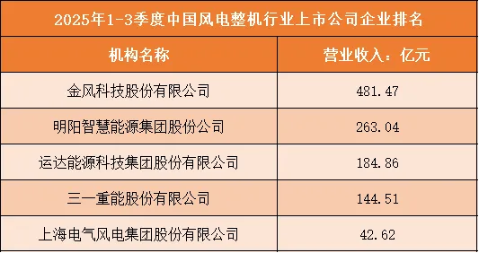 根据申万行业分类,2025年1-3季度中国风电整机行业上市公司按营业收入排名如下:(A股上市公司)