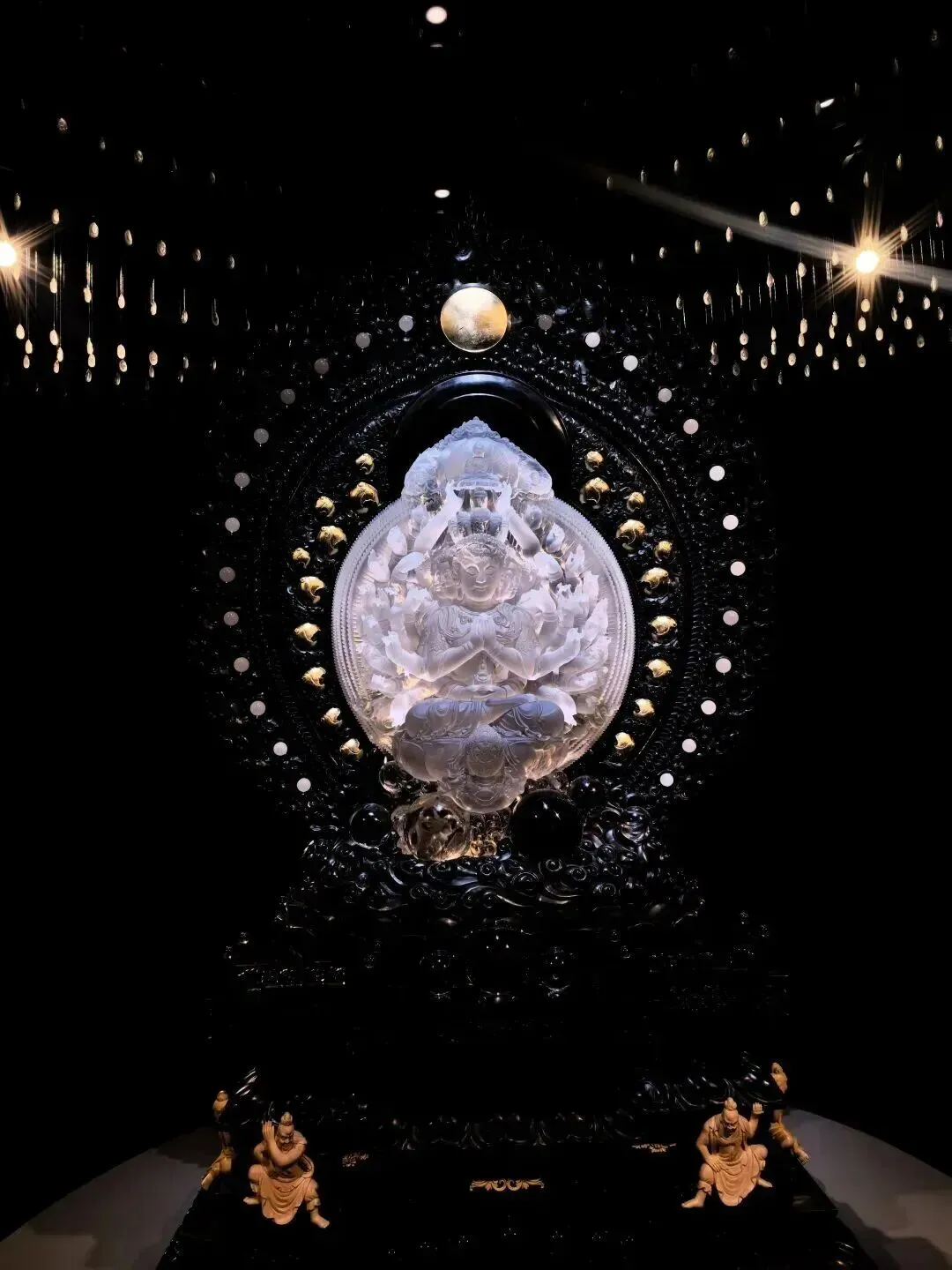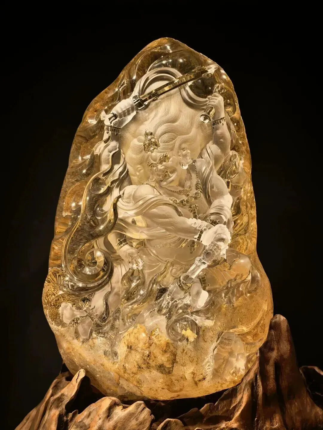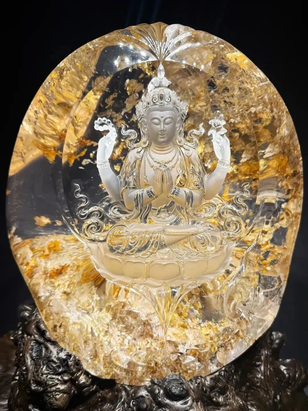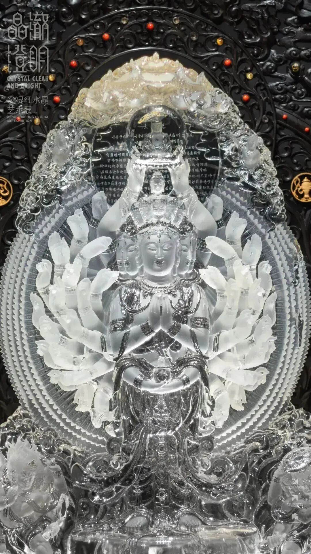 此作以敦煌元代壁画为蓝本,取用即硬又脆的天然水晶,精琢四十二臂千手观音。菩萨法相庄严慈悲,手臂立体悬空,每只手掌眼目清晰,手印各异。工艺上结合光亮与磨砂处理,衣袂流转间既见盛唐遗风,又透当代审美。