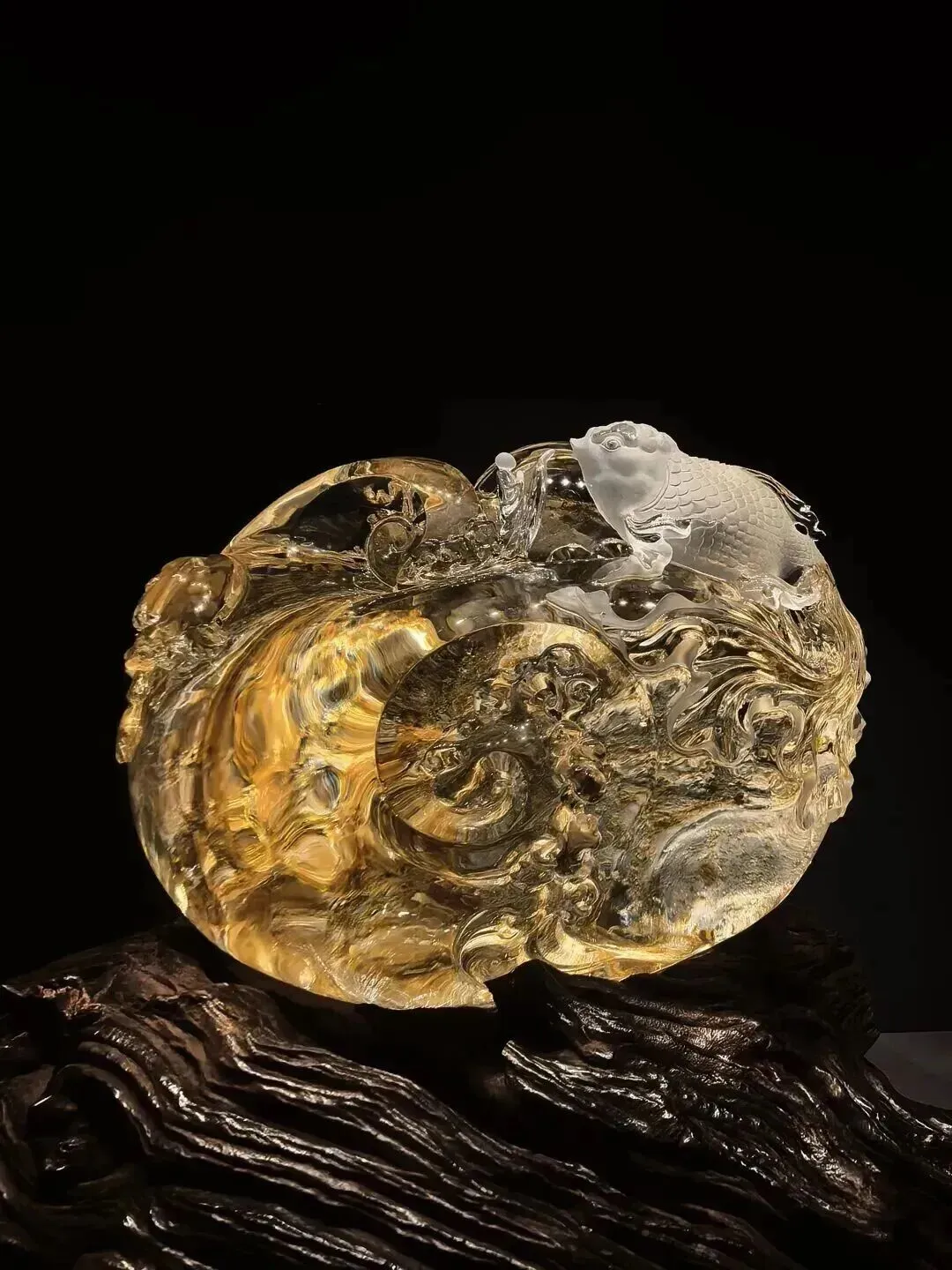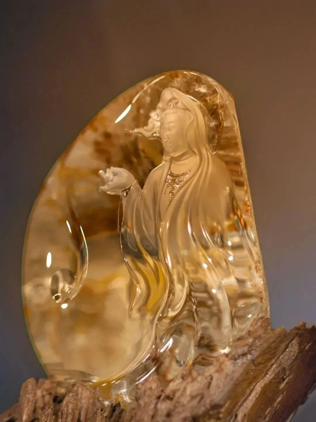 作品选用天然皮色水晶,施以精雕加写意、亮光与磨砂渐变之技法,营造出空灵悠远的意境,禅音渺渺,水声潺潺,催润心花,融化于无形,仿佛天地万物全都溶在了这亦真亦幻的意境之中。