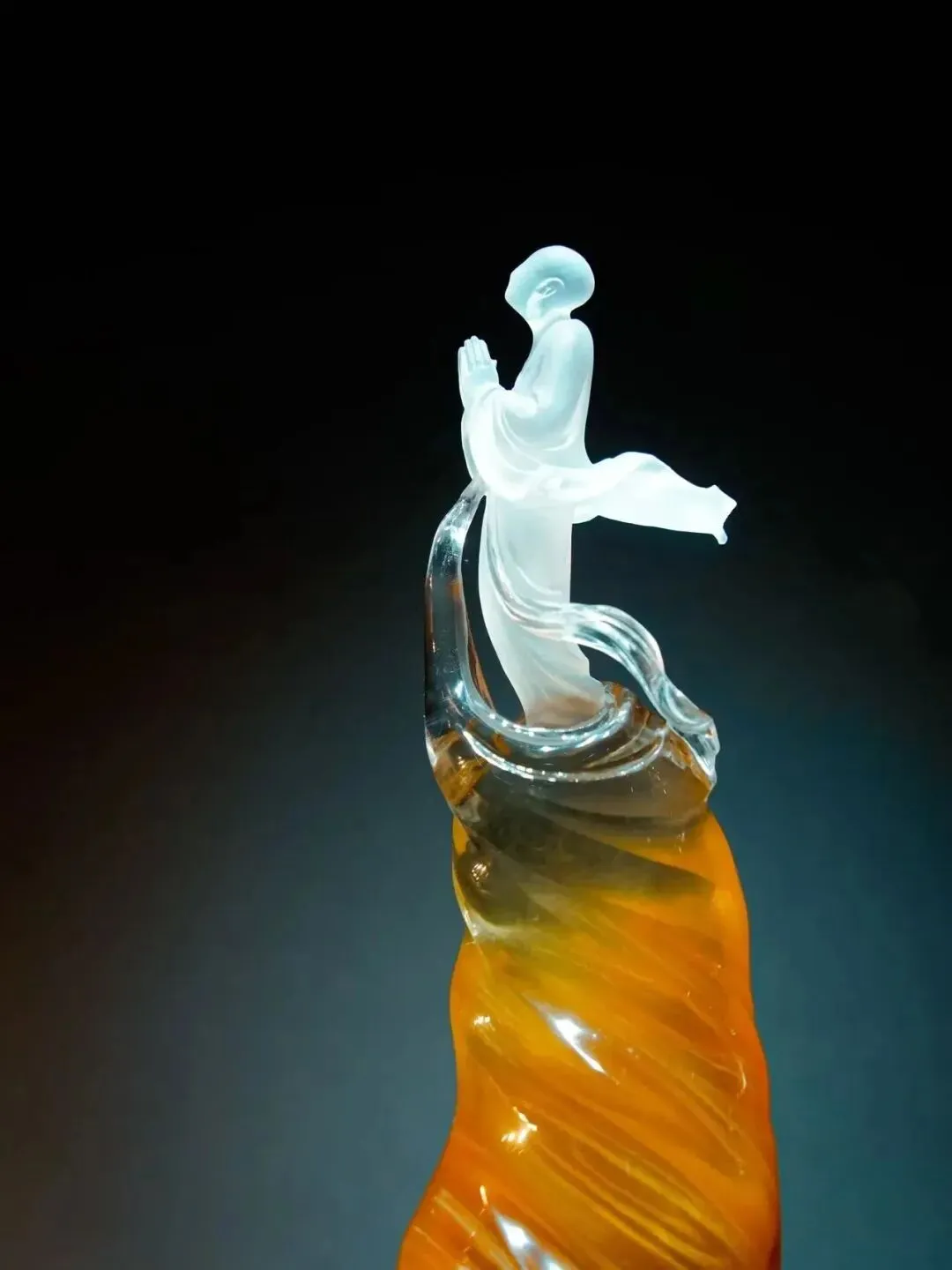 水晶,古称水精,此作以天然晶体为媒,巧妙运用水晶的折射与透光特性,塑造出水之幻化的精灵形象。作品将水的灵动与晶石的永恒完美交融,共谱一首跨越形态的视觉诗篇。