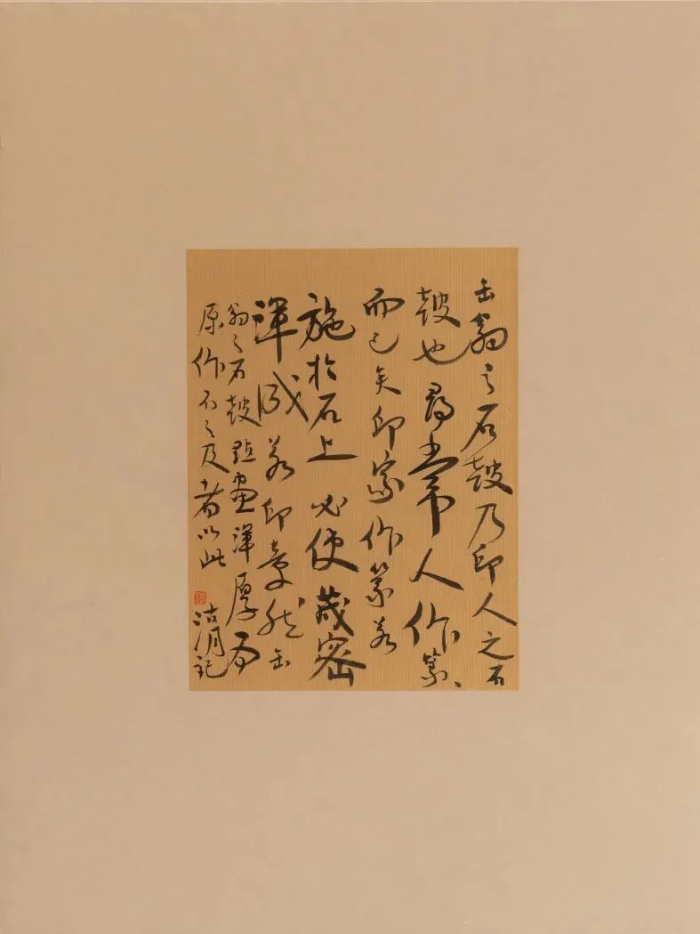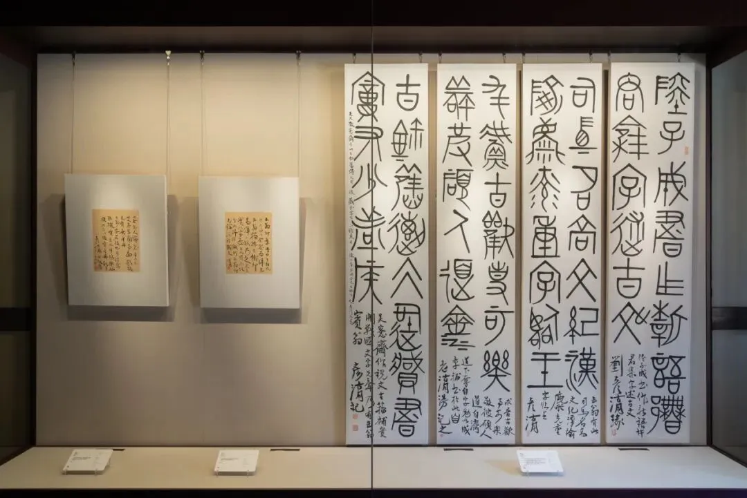 《论缶翁札记》系列作品,是刘彦湖基于对吴昌硕书法篆刻艺术长期钻研的心得,以札记的形式用日常书写的行书表现出来。与本次展览中吴昌硕的书法作品和建筑空间形成互文,是文脉相传的当代体现。观众品读文本,既能感知当代艺术家对于先辈的景仰,又能领略艺术家间的异代相知,即当代艺术家间的体贴入微。此外,该系列作品亦彰显出中国书法艺术的多元魅力,它不仅是历史与情感的记录载体、文人往来的精神纽带,更在书法笔意的精妙、形式的变幻等方面,展开了一场趣味盎然,富有文化深意的对话。
