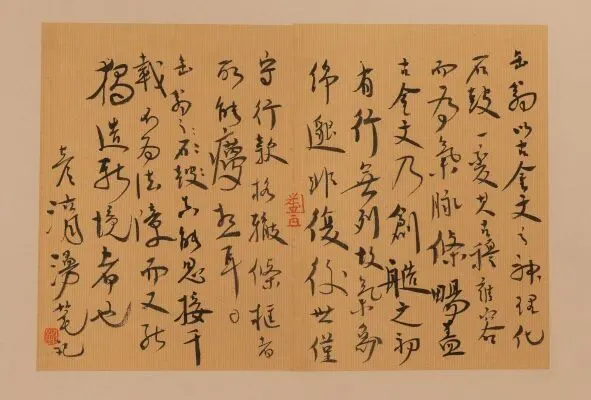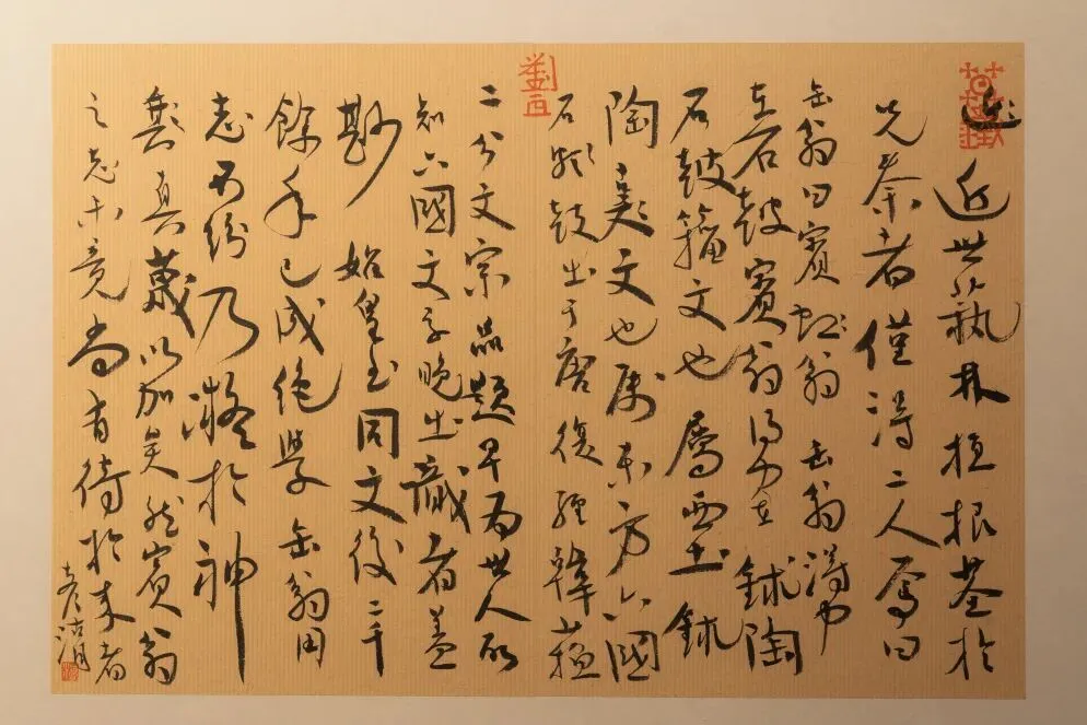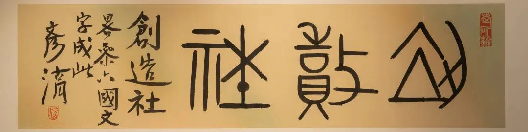 刘彦湖结合战国文字体系创作的书法《创造社》援引为新文化运动时期的艺术群体“创造社”。“创造社”以“为艺术而艺术”为核心理念,强调文学艺术的独立审美价值与个体情感表达,与同期文学研究会所提倡的“为人生而艺术”形成了不同的艺术主张。对于艺术形式和艺术社会效应的两种追求与探索,贯穿于20世纪中国美术发展。而书法艺术恰恰兼容了这两种主张:其文本既有对于现实事态的记录与表征,其形式和笔意则强调了艺术本体的在场。