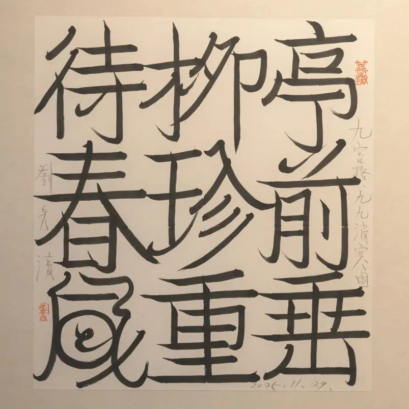 本次展览中,其六国古文字作品和论缶翁札记,可以看作他在传统语境下,同前辈宗师所展开的隔空对话。而他的《九宫格》系列作品,则可以视为其在书法当代性探索上所进行的一种尝试。