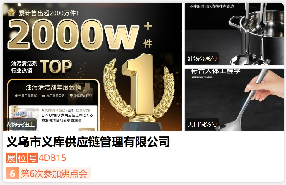 义乌市义库供应链管理有限公司,是义乌库存行业领先者,自2007年成立以来专注供应链17年,在杭州设有研发中心、工厂分布于广东、浙江、上海、江苏、湖北,在日本、德国、越南、马来西亚、阿联酋、俄罗斯均设有办事处。并有抖音、快手、天猫、视频号、小红书、快团团、阿里巴巴等线上供货渠道。义库供应链合作工厂超万家,每月累计上新全品类产品近百款,拥有1万平仓储面积的仓库。义库秉持品先行 诚立身 勤立业 事利他的价值观-展位号:4DX12-