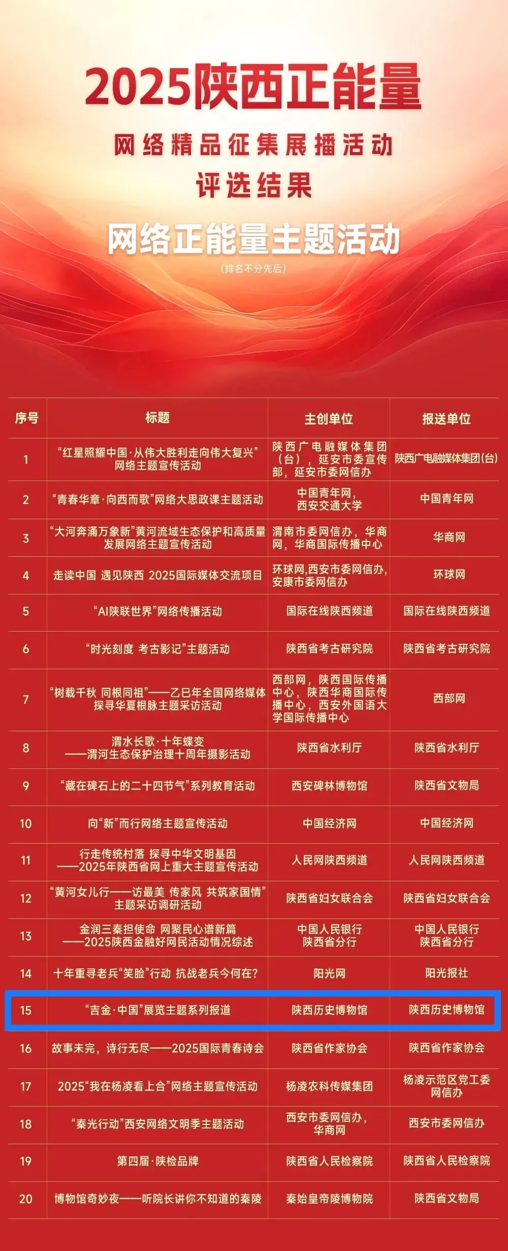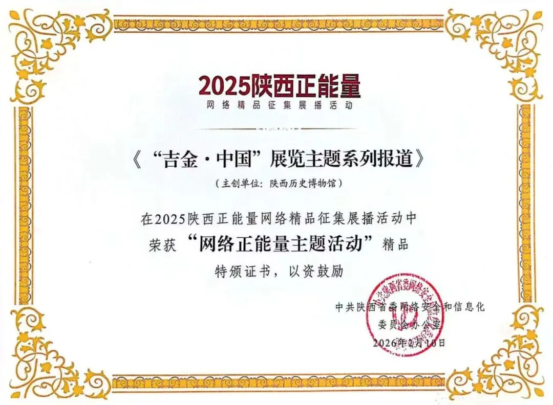 2月10日,由陕西省委网信办主办的“2025陕西正能量网络精品征集展播活动”评选结果正式揭晓。陕西历史博物馆原创展览“吉金·中国——中国青铜文明的兴起与繁荣”继入选2025年度“弘扬中华优秀传统文化、培育社会主义核心价值观”主题展览重点推介项目之后,凭借鲜明的主题导向、扎实的学术支撑与鲜活的传播实践,再次荣膺“网络正能量主题活动”称号。