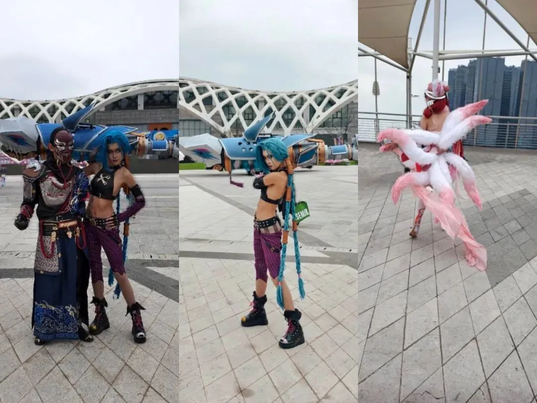 走出展厅,年轻人的潮流气息扑面而来。这里有《王者荣耀》人气法师妲己的「青丘九尾」皮肤cos,造型以粉白渐变的九尾狐尾为核心,搭配红粉相间的头饰与飘逸的纱裙,完美还原了妲己作为上古狐妖的灵动与魅惑。还有出自国漫《画江湖之不良人》的天暗星(李星云),以标志性的红色面具、深蓝色古风战衣和龙纹刺绣尽显神秘与霸气;以及来自游戏《英雄联盟》的金克丝,以蓝色双马尾、露脐上衣和巨大的武器道具,复刻了她疯狂不羁的标志性形象。