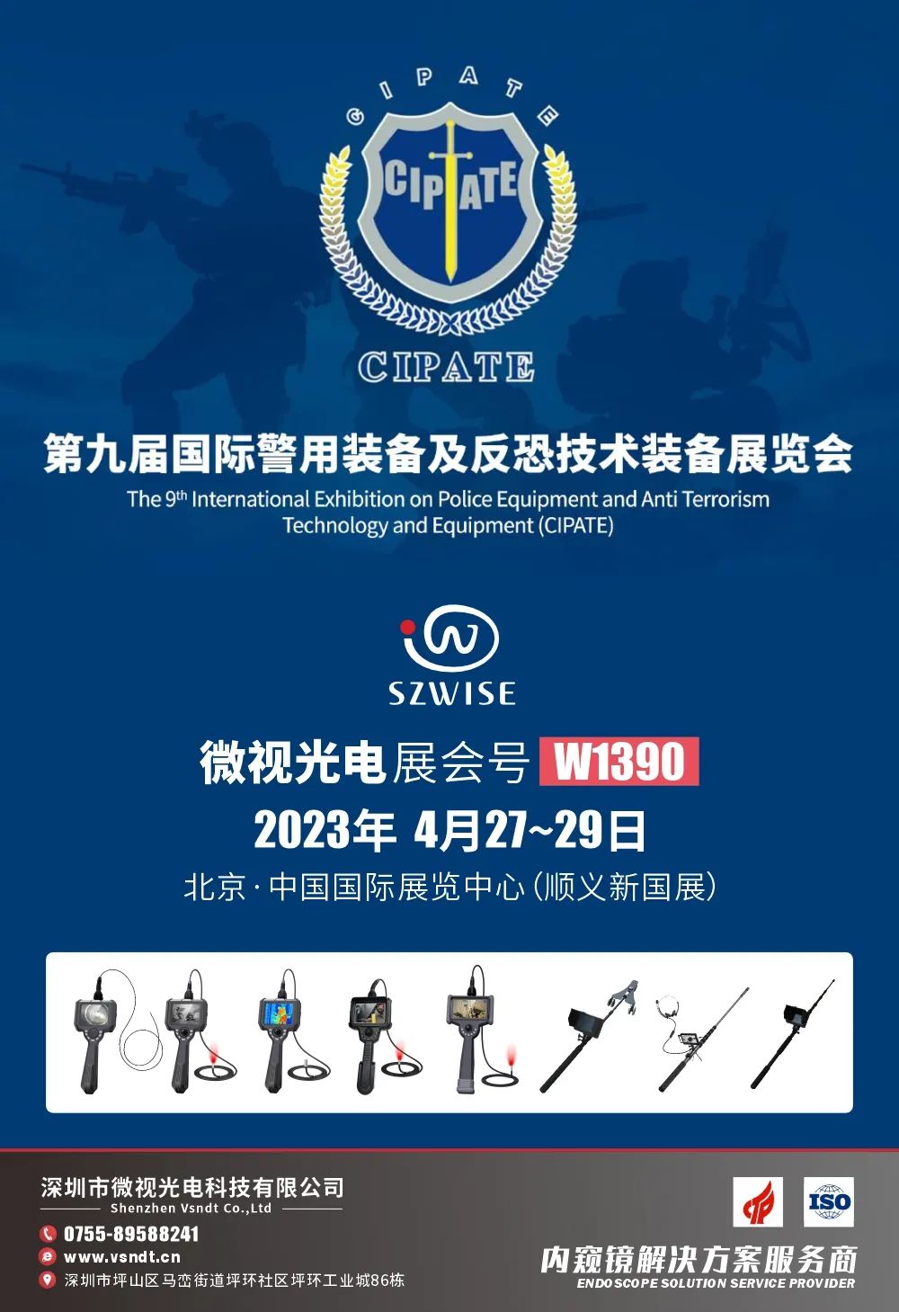 深圳微视将于2023年4月27~29日参加位于北京中国国际展览中心召开的第九届国际警用装备及反恐技术装备博览会,届时公司将带上旗下多款最新智能一体化红外软管窥镜、柔性观察镜、超细锁孔内窥镜、天棚搜查镜、车底检查镜、门缝侦查镜等产品亮相参展,展位号:W1390;在此诚挚邀请警用装备以及军警反恐行业的各个合作客户以及合作单位共赴盛会,在展会现场共同探讨、指导学习!